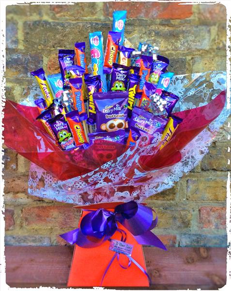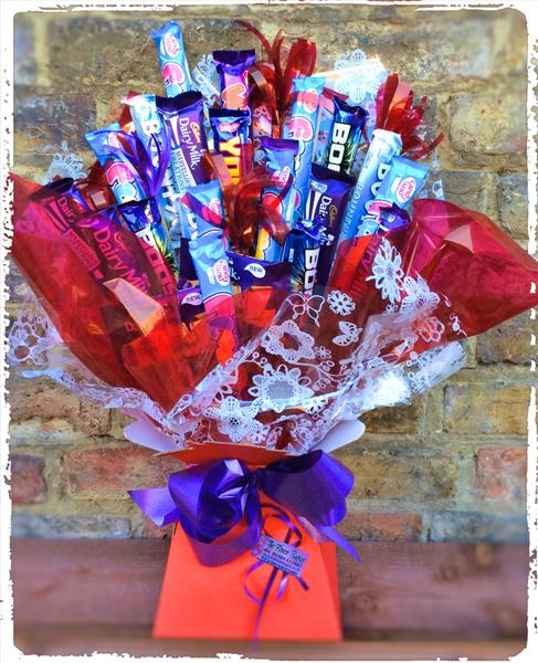 A beautiful bouquet containing chocolates for the standard size option and sweets, lollipops and candy for the large price option. We can also add some dark chocolate to your gift!