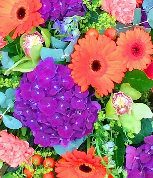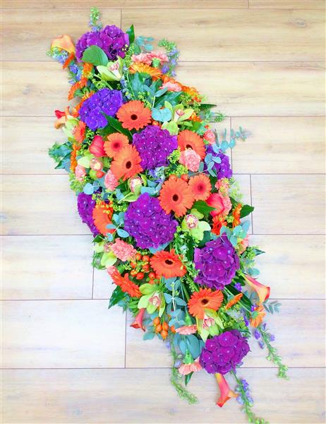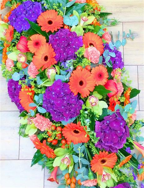 Such a beautiful floral tribute ,so vibrant with It’s oranges, purples and lime green