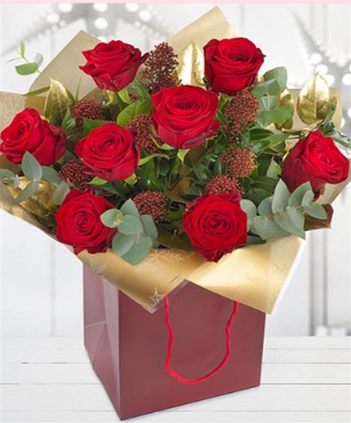 A fabulously festive hand-tied bouquet of deep red luxurious red roses.