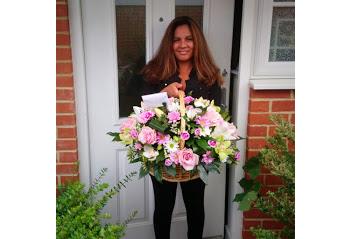 A dainty all round basket arrangement in light pink and cream tones as pictured or in your choice of colours.