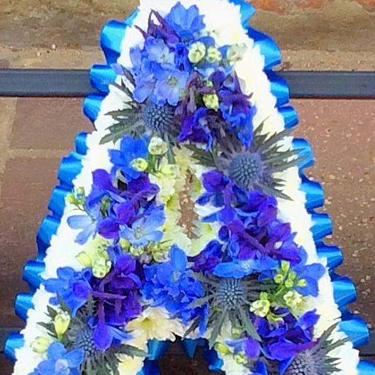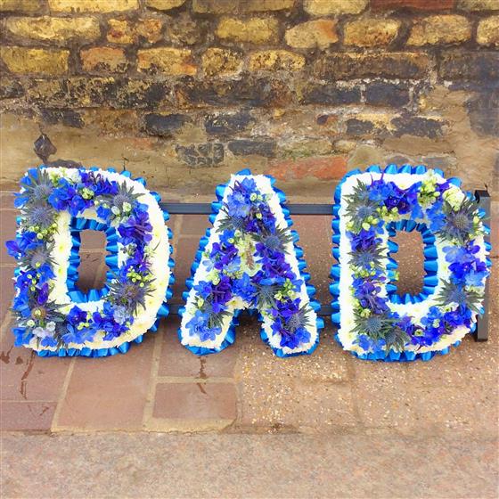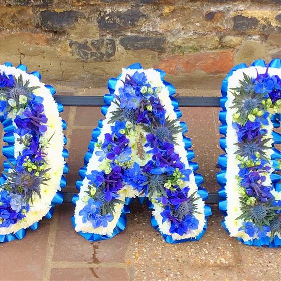 This beautiful tribute is partly based like traditional letters but with a twist of mixed flowers through the centre of each letter