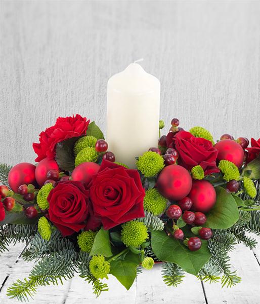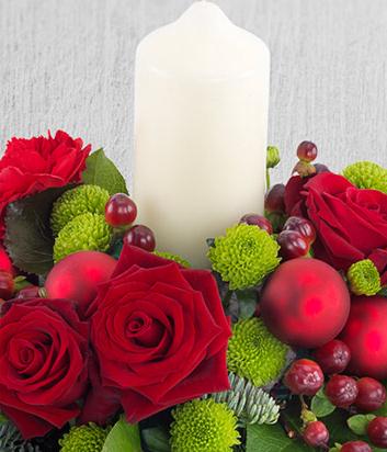 A fabulous Christmas flower centrepiece Arrangement. A white church candle sits amongst red Roses, Carnations and green spray Chrysanthemums.