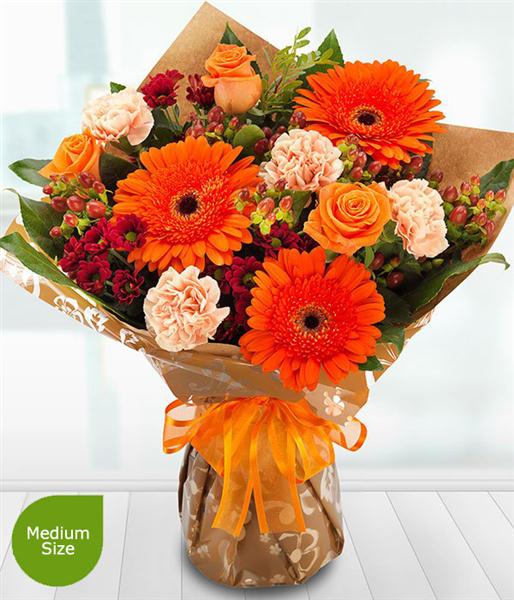 A superbly sumptuous and absolutely gorgeous aqua pack . Orange Roses and Gerberas sit amongst burgundy Spray Chrysanthemums and peach Carnations.