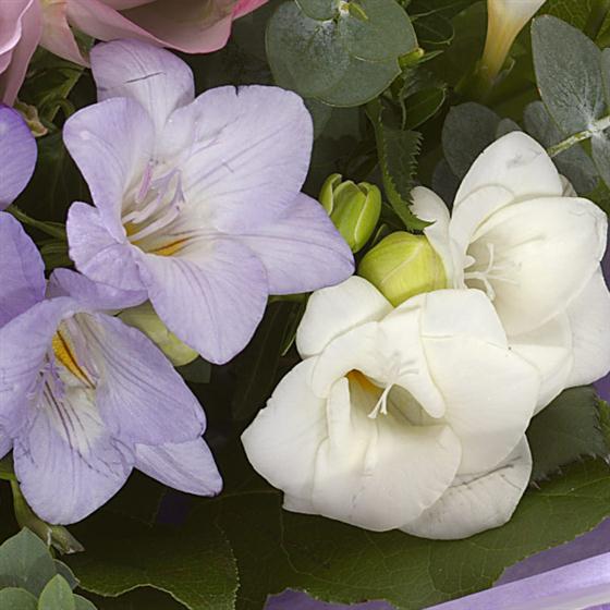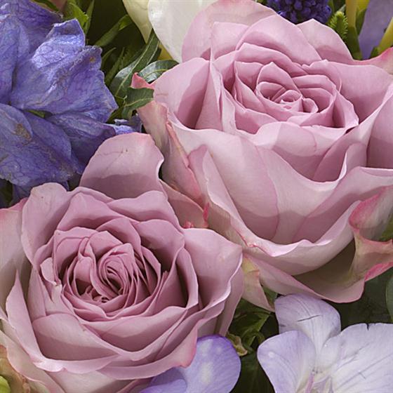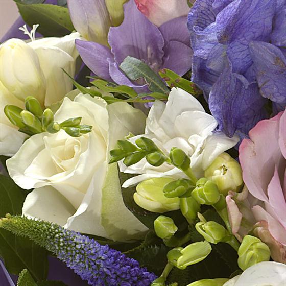 A classic Biedermeier hand-tied of mauve Roses accompanied by blue Aconitum, Veronica and lavender and white scented Freesia.