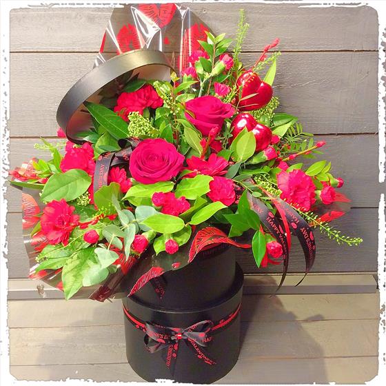 This beautiful hatbox is full of red seasonal flowers which includes the stunning Red Naomi Rose. The perfume from this rose is amazing and will enjoy being centre stage for your valentine. 🥰🌹🥰