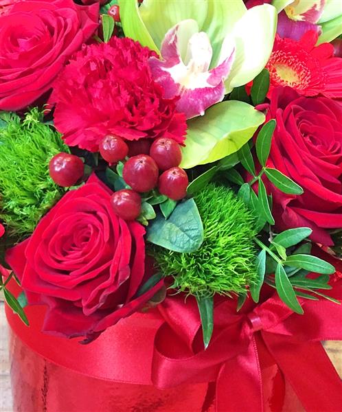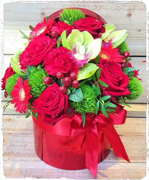 This luscious red hatbox is the perfect gift for that someone special and is full of roses, orchids , berry’s and germini and complementary foliage and is available in 3 sizes .
