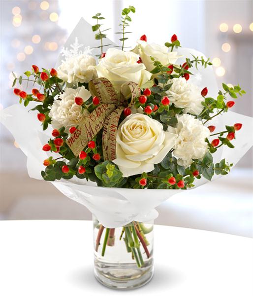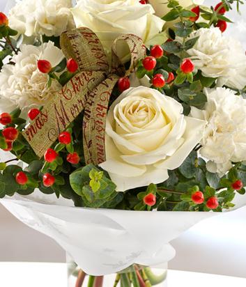 White Roses and Carnations have been beautifully married with red Hypericum berries in this simply divine Christmas flower Bouquet.