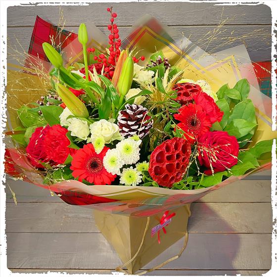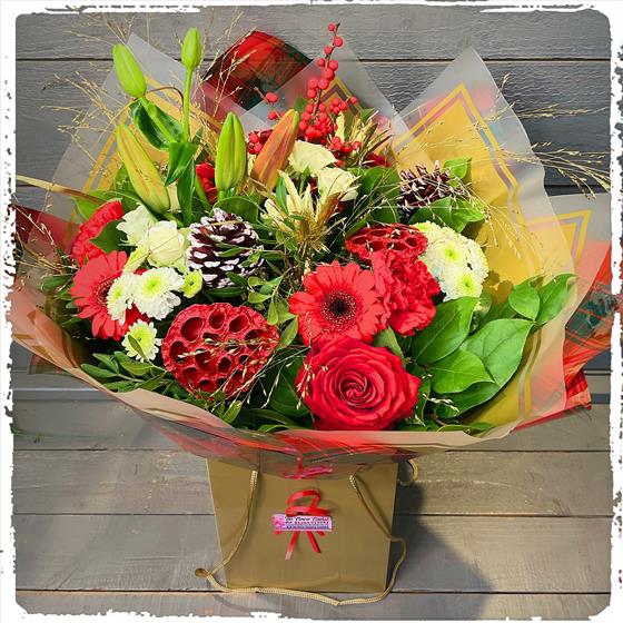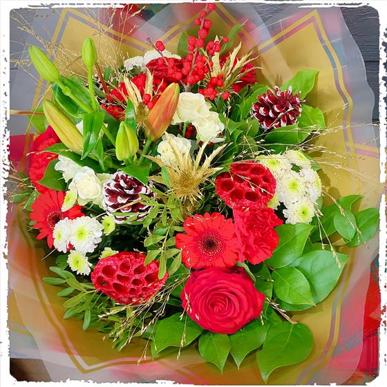 A beautiful opulent Christmas bouquet featuring rich red, crisp white, and lush greens, elegantly accented with touches of gold. This luxurious arrangement captures the spirit of the season and makes a stunning gift for celebrating Christmas in style
