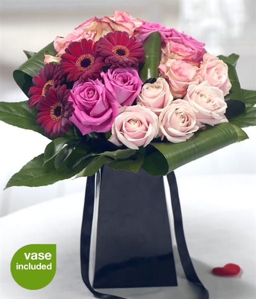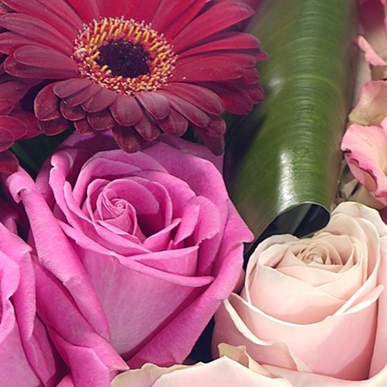 A luxurious handtie featuring pink Roses, complemented perfectly by deep red velvety Germini. Striking Aspidistra and Aralia leaves complete this exquisite arrangement.
