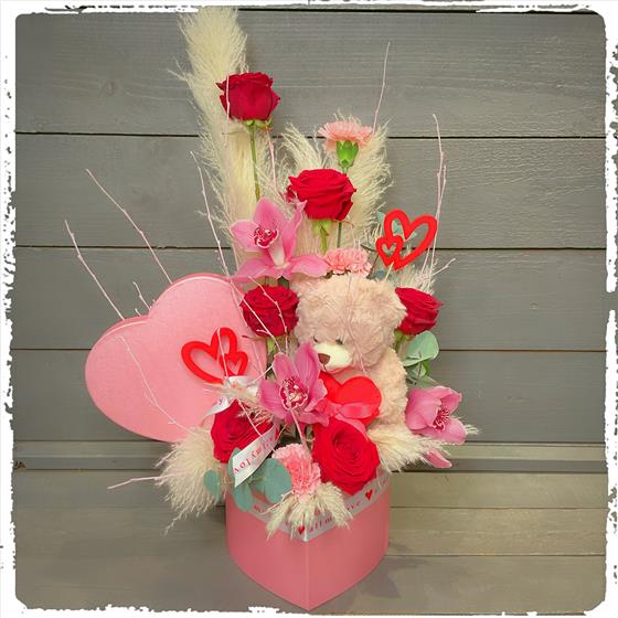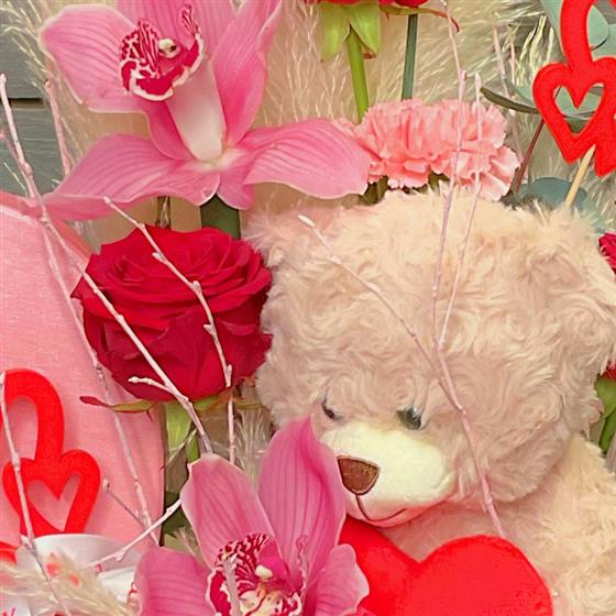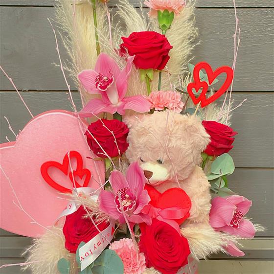 A truly eye catching pink heart hatbox, luxuriously arranged with our signature Red Naomi Roses, Soft pink orchids and delicate carnations. Finished with flowing pampas grass and elegant satin ribbon, and complemented by beautiful plush teddy holding a heart ♥️ - a timeless expression of love and indulgence.