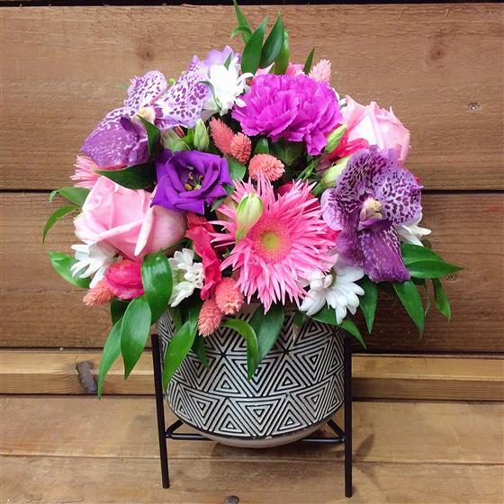 This lovely design has been created in a raised pot .. The metal stand has 2 settings which can be easily switched to the high and low position.