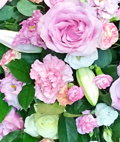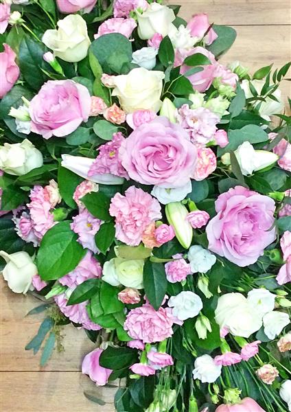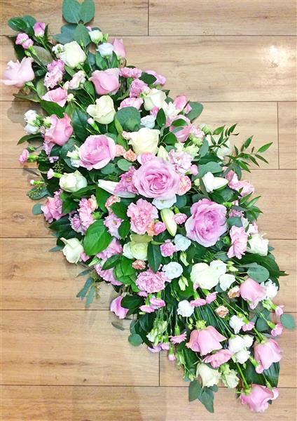 A stunning Pink and white casket spray designed with a mixture of pink and white roses with other complementary pink and white flowers and foliage .