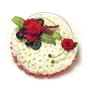 A white Chrysanthemum based posy with red ribbon edging, complete with red & green flower spray including Roses, Amaranthus & Hypericum. Size: 25cm (10").